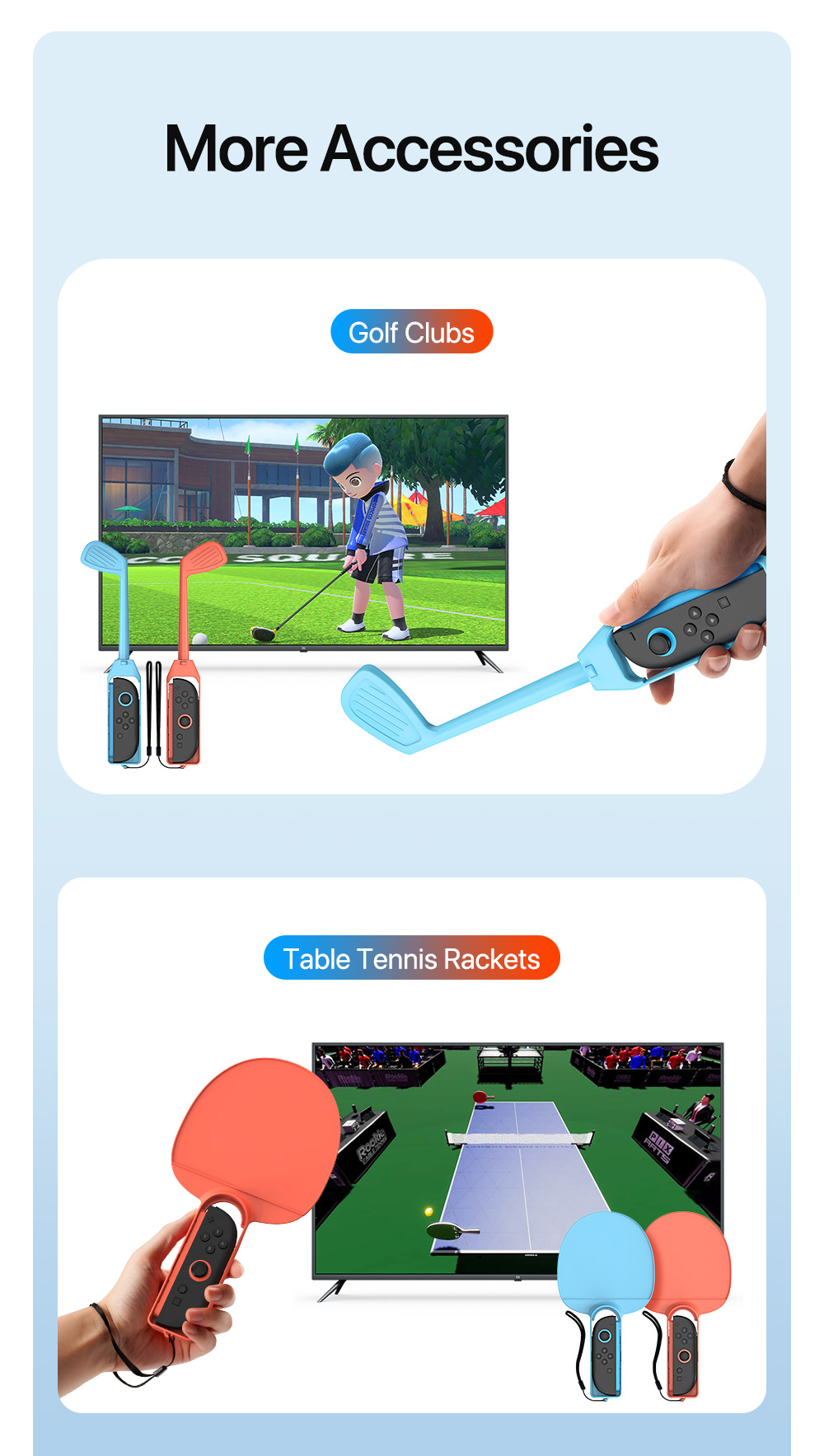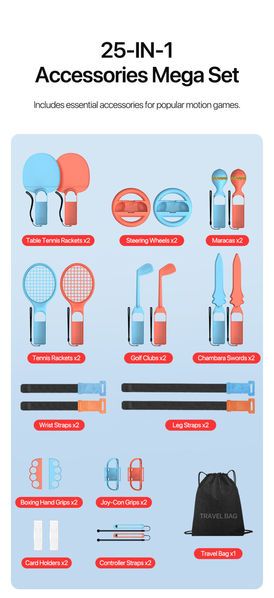 25-in-1 Mega Set – All essential motion game accessories in one bundle (tennis rackets, steering wheels, golf clubs, etc.).
