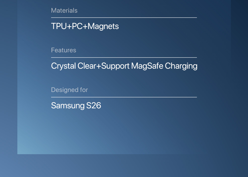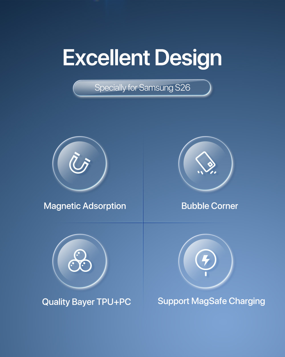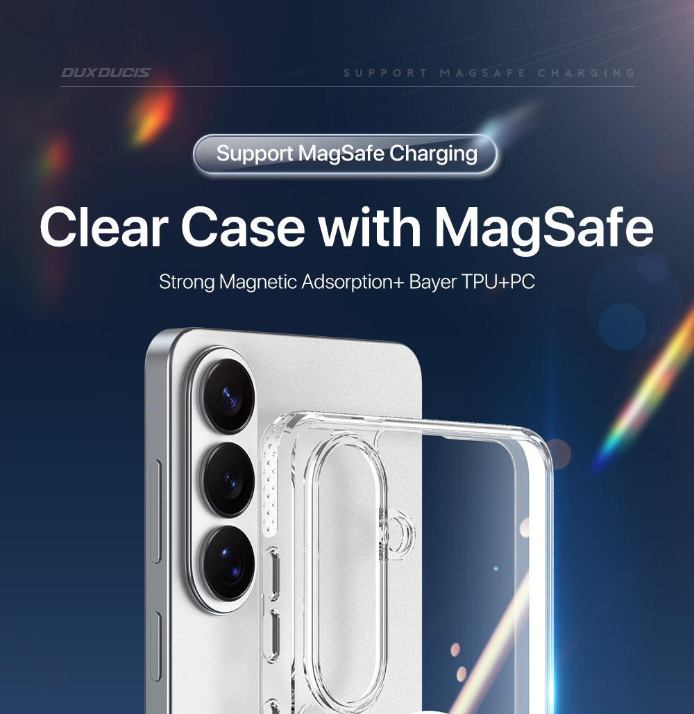 This crystal clear case with MagSafe for Samsung S26 all materials are optimized to prevent yellowing over time.