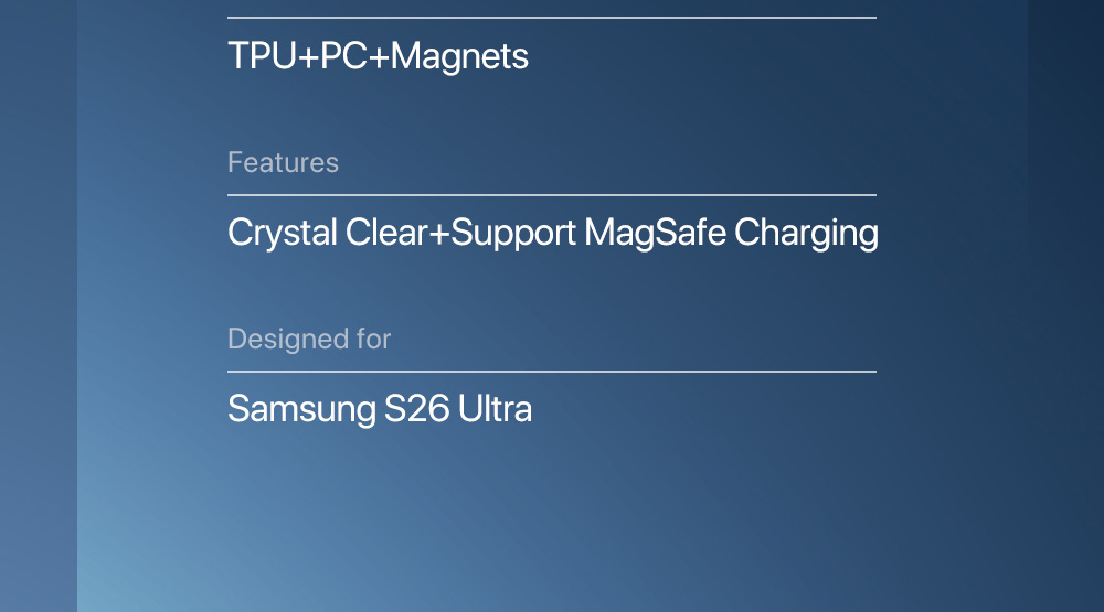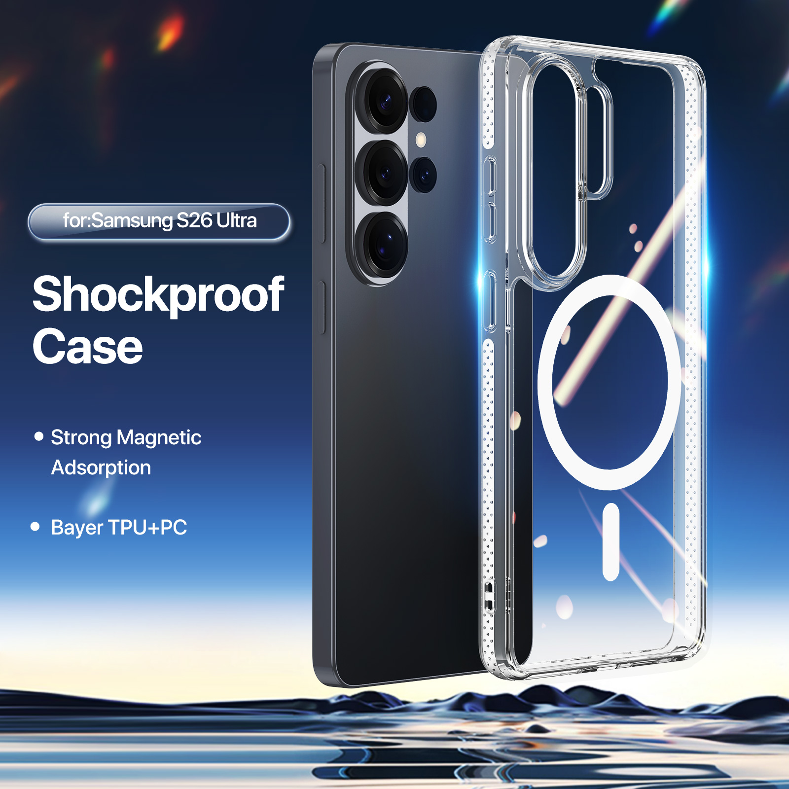This crystal clear case with MagSafe for Samsung S26 Ultra all materials are optimized to prevent yellowing over time.