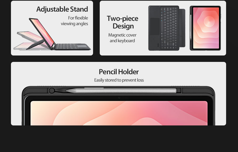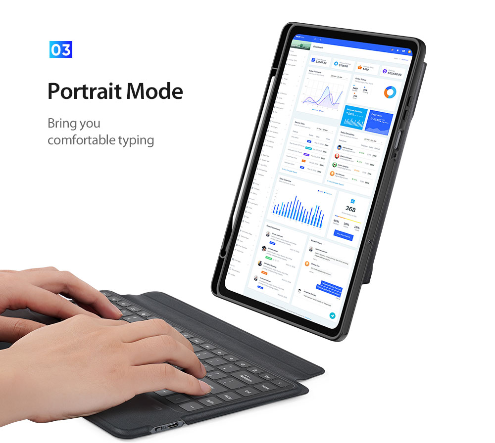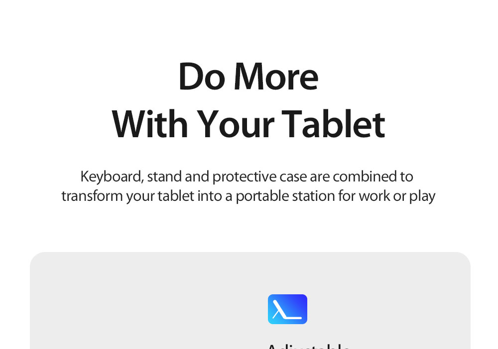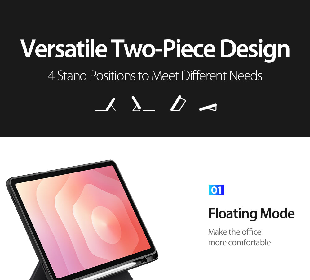Keyboard, stand and protective case are combined to transform your tablet into a portable station for work or play. Versatile two-piece design with 4 stand positions to meet your different needs.