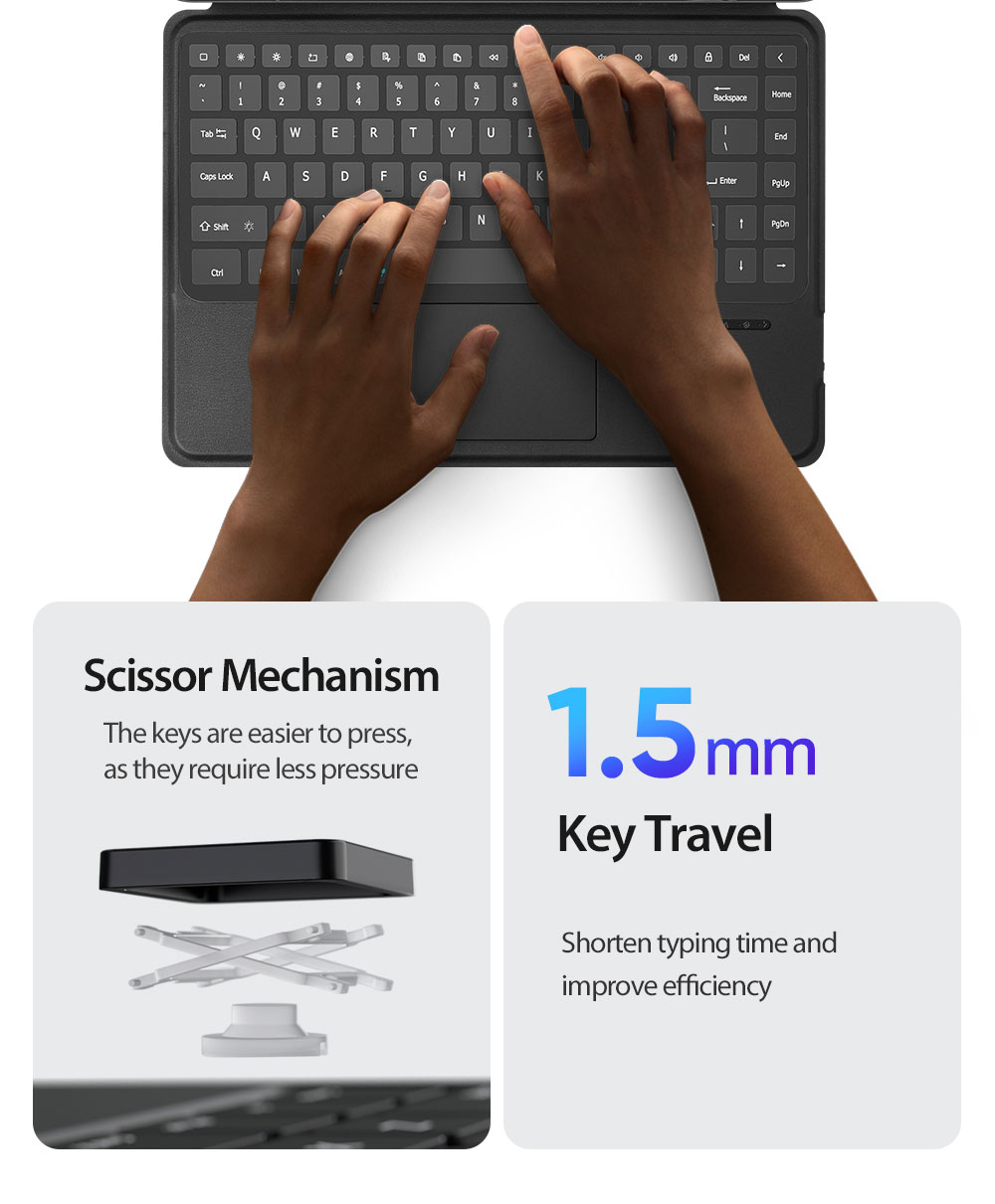 It has a trackpad which supports multi-touch gestures to make your work very convenient, a scissor mechanism with 1.5mm key travel for quiet and responsive typing.