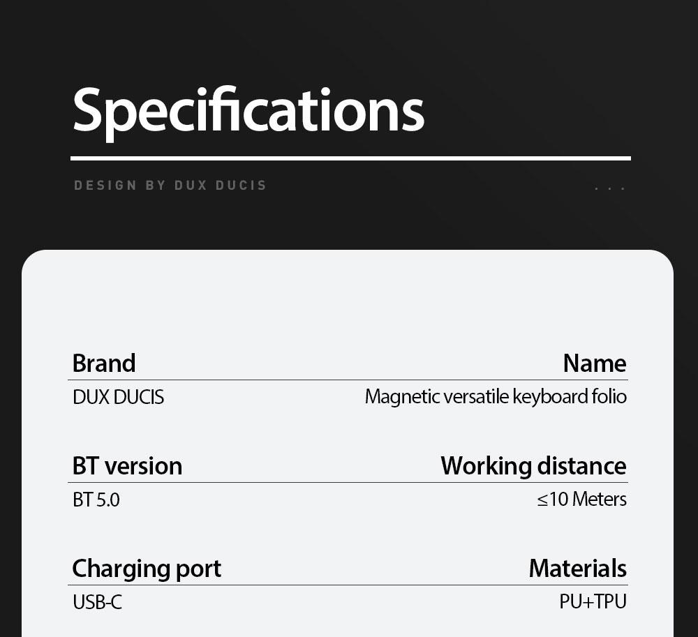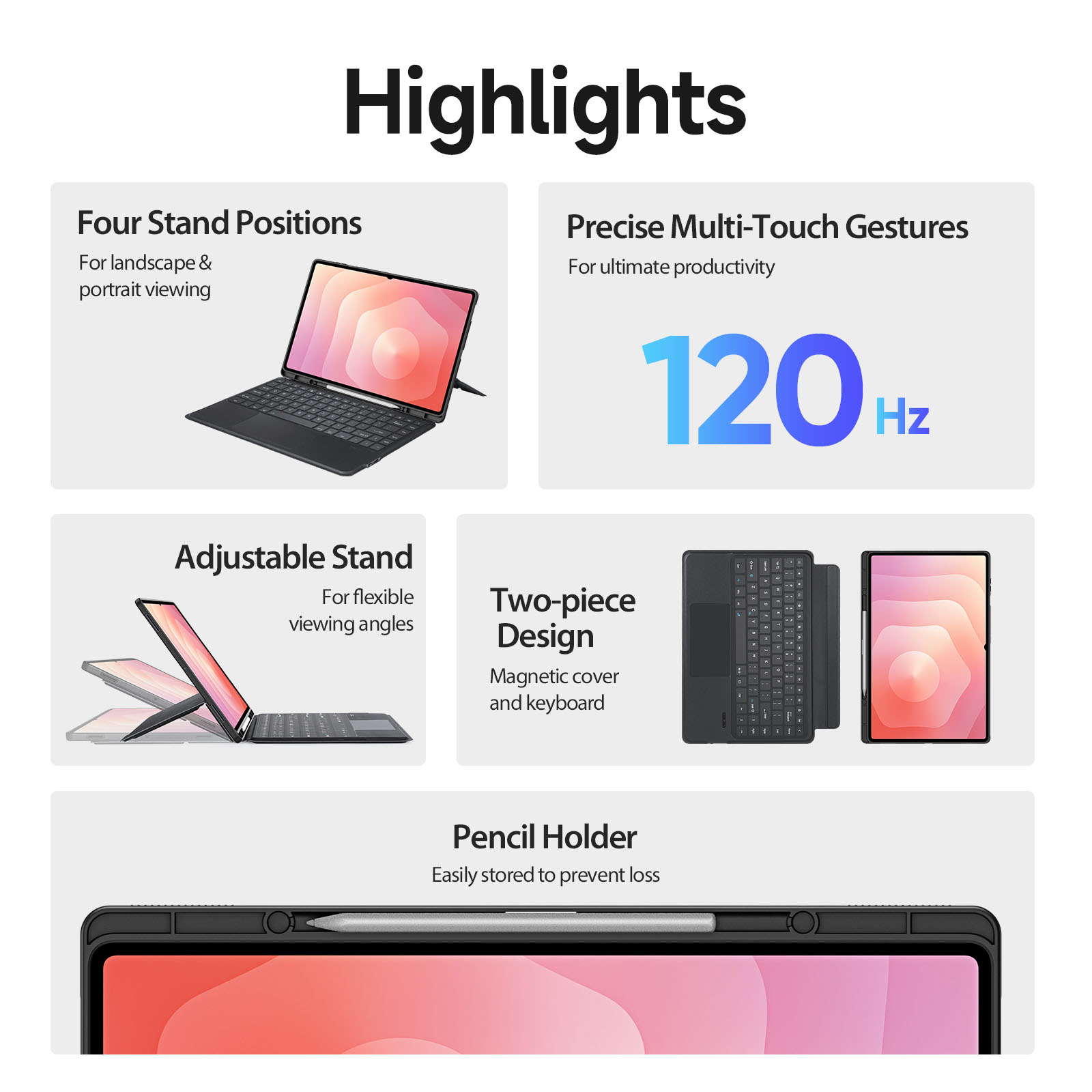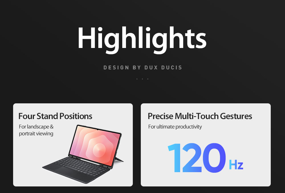 Keyboard, stand and protective case are combined to transform your tablet into a portable station for work or play. Versatile two-piece design with 4 stand positions to meet your different needs.