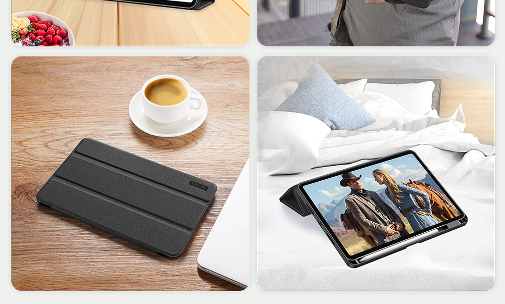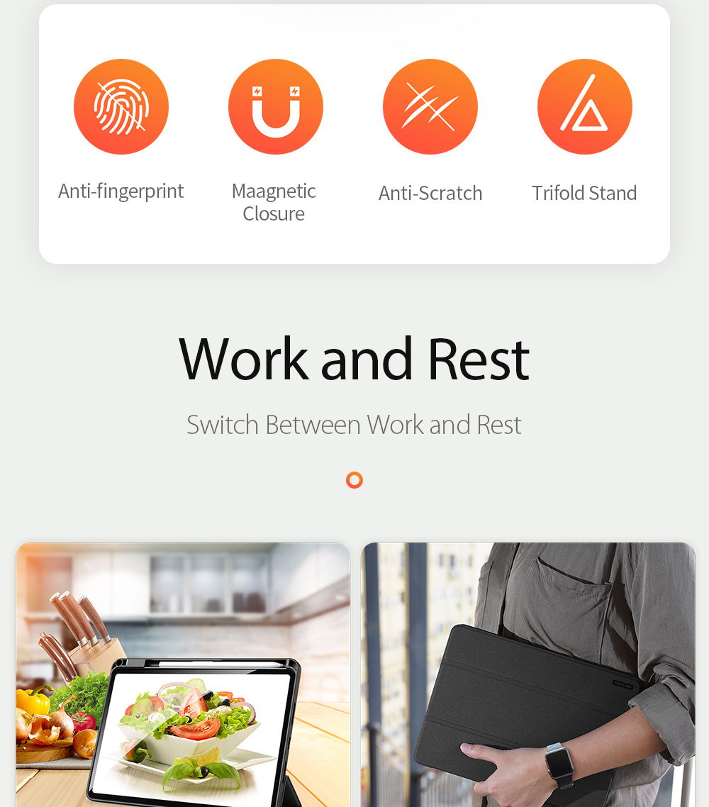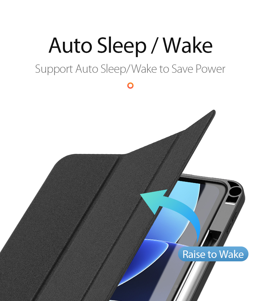 Comes with wake/sleep function, open the case, the tablet wakes up; close the case, the tablet sleeps.