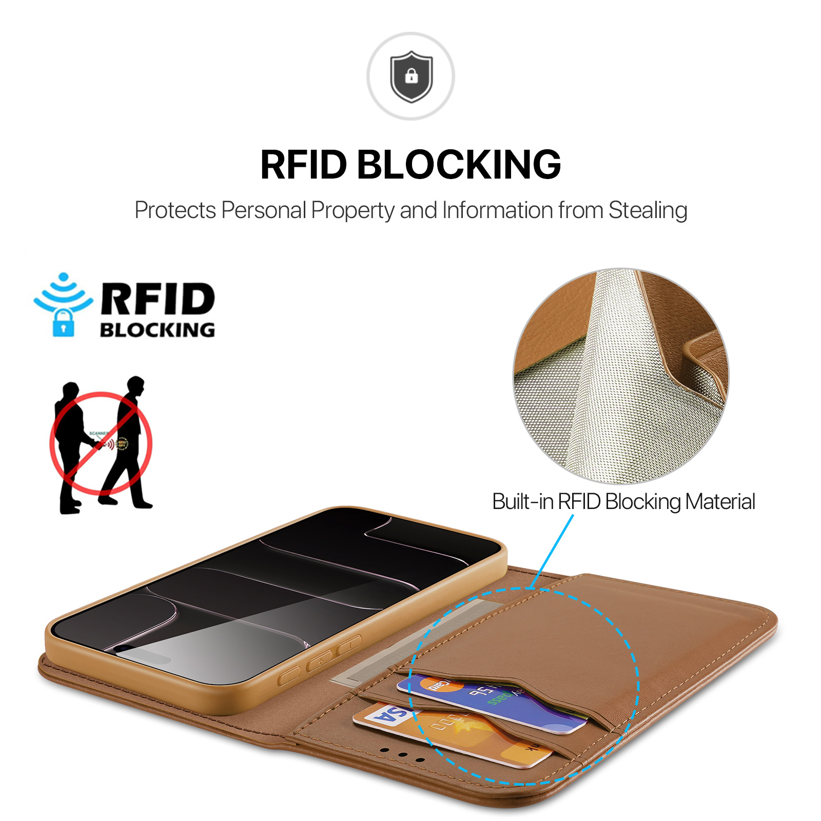 Made of genuine leather with RFID blocking material to protect personal property and information from being stolen.