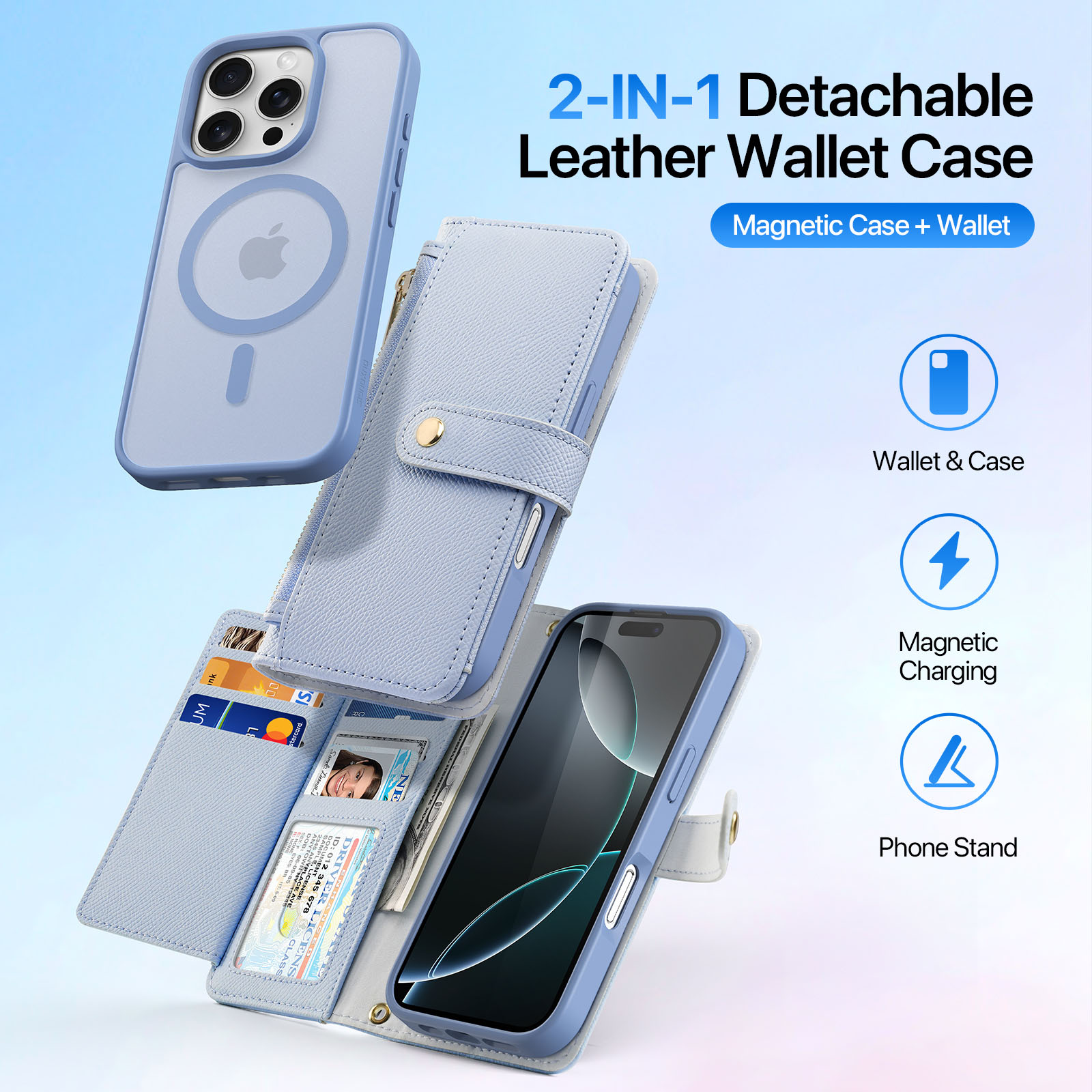 The wallet-style mobile phone leather case and magnetic back cover are 2-in-1;