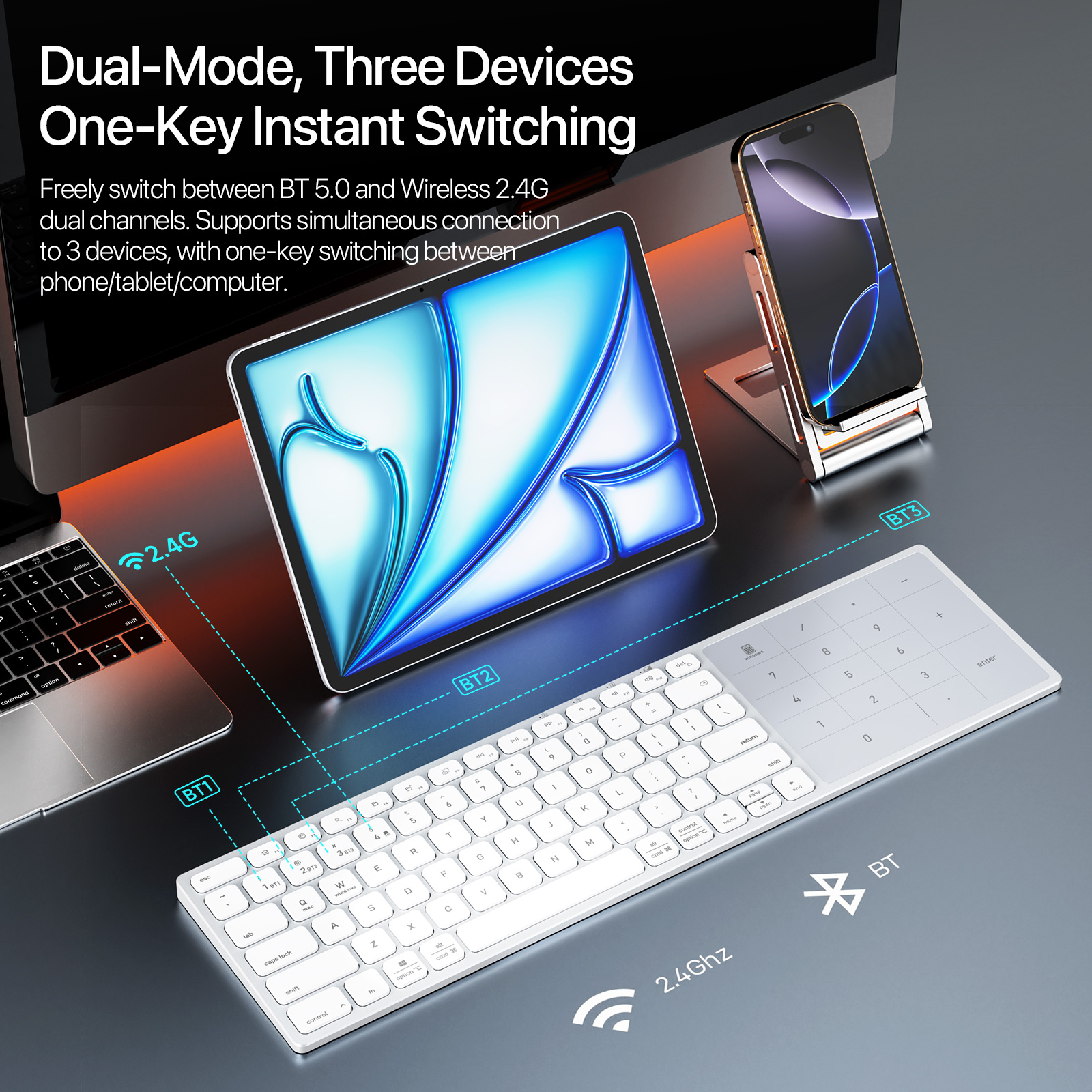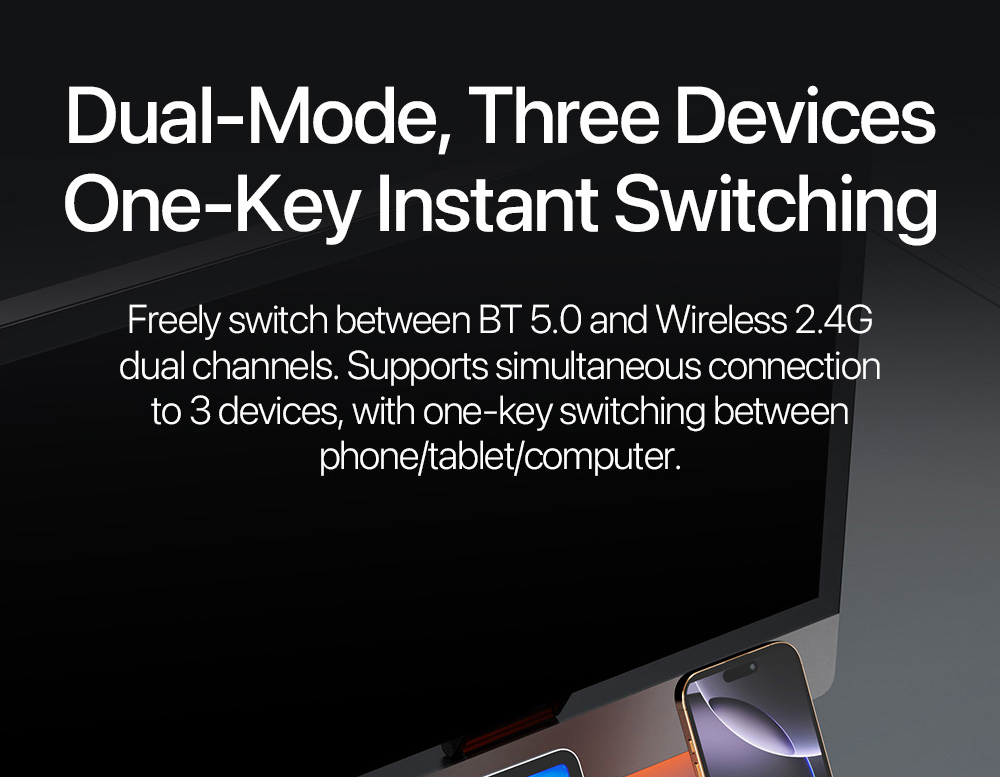 1. Dual-mode connectivity (Bluetooth 5.0 & 2.4G) supporting 3 simultaneous devices