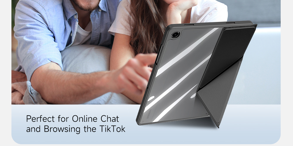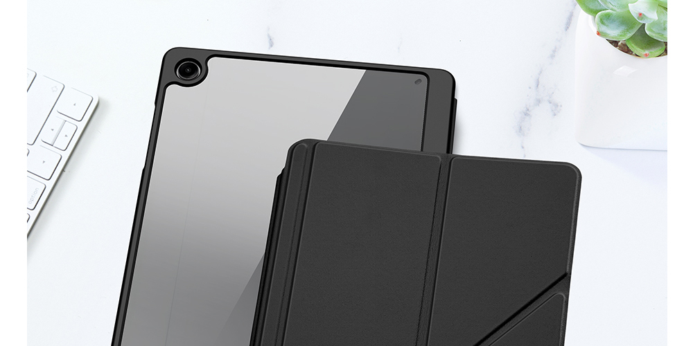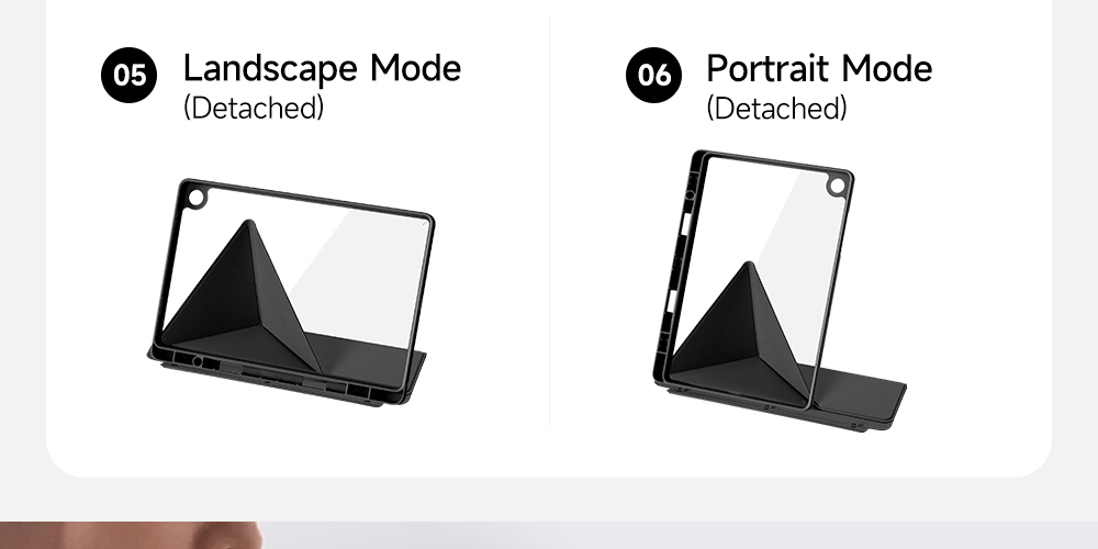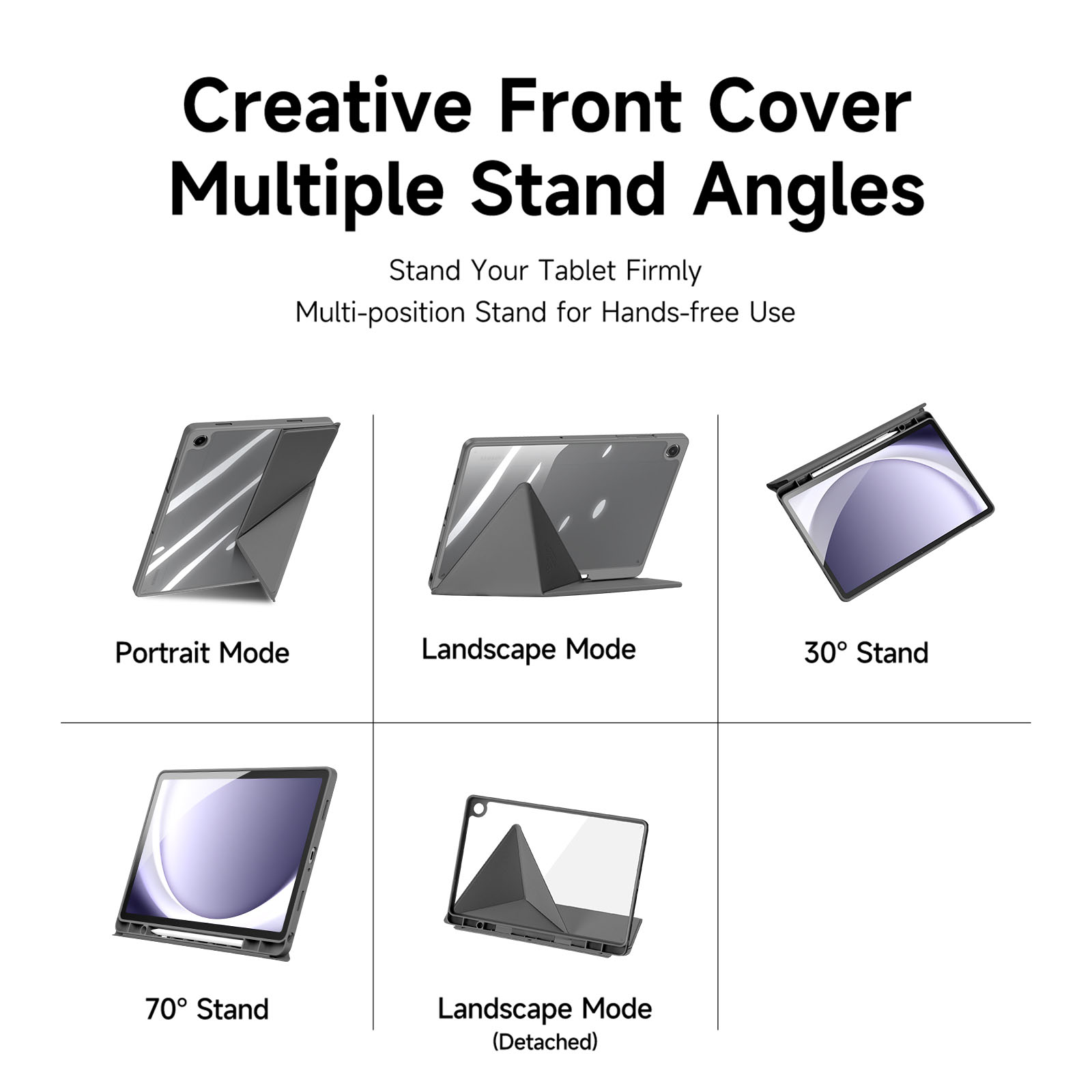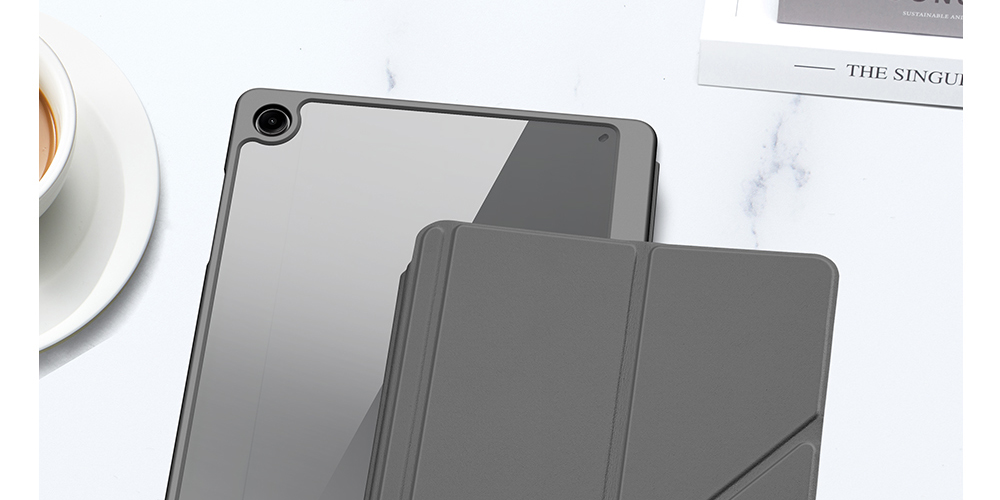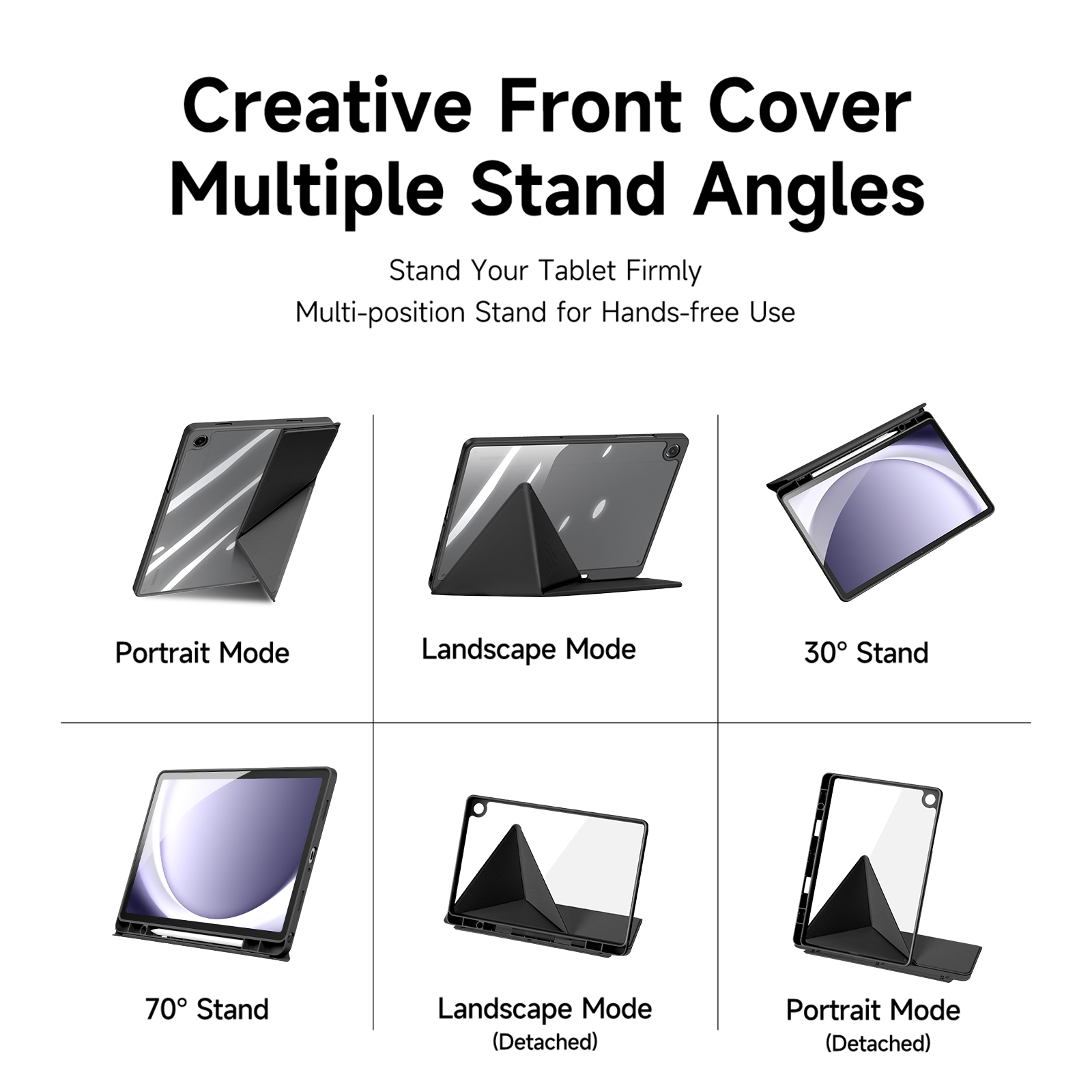 Creative front cover offers multiple stand angles to free your hands when viewing, browsing on the tablet. Clear back cover can be detached from the front cover and used independently, which is perfect for playing games on the tablet.