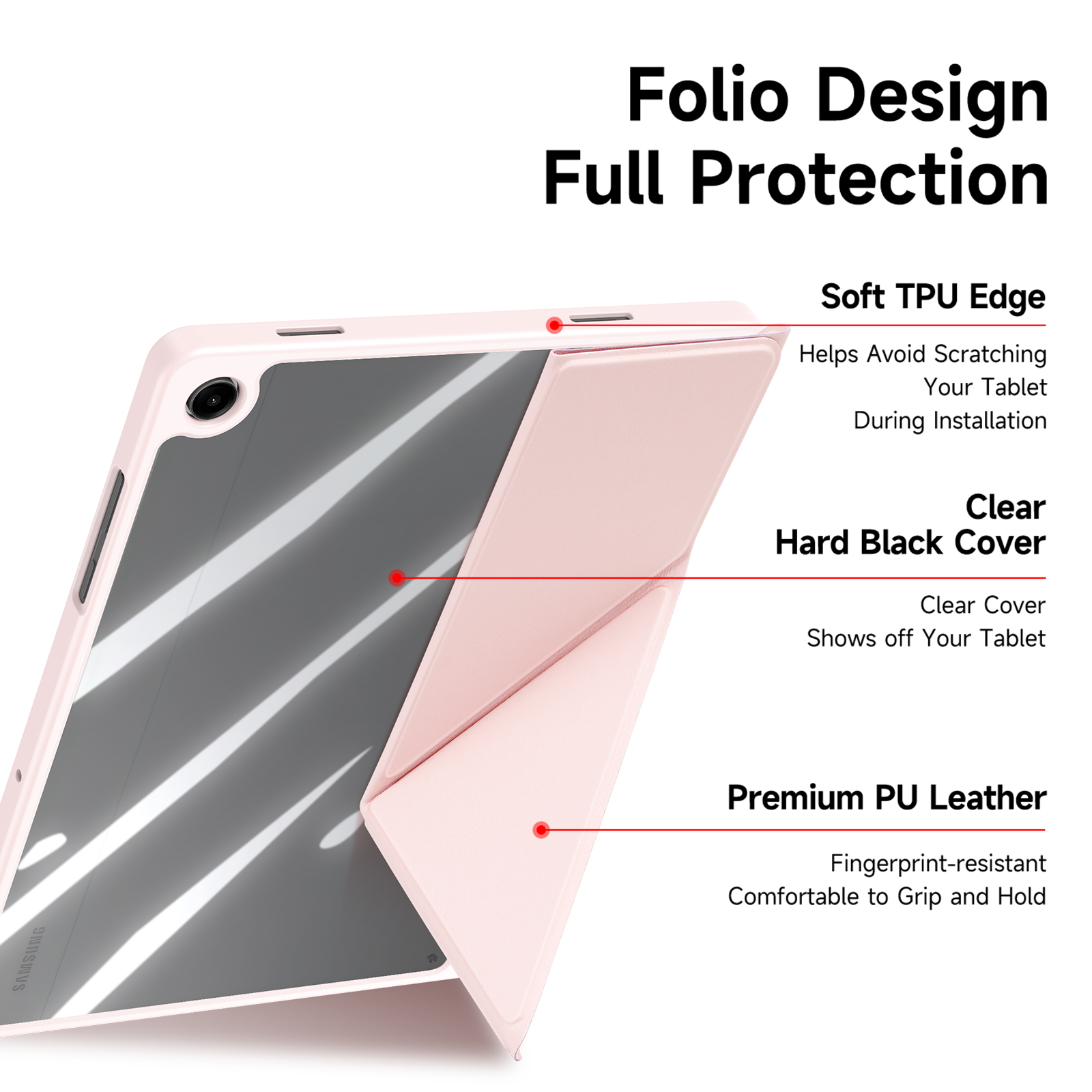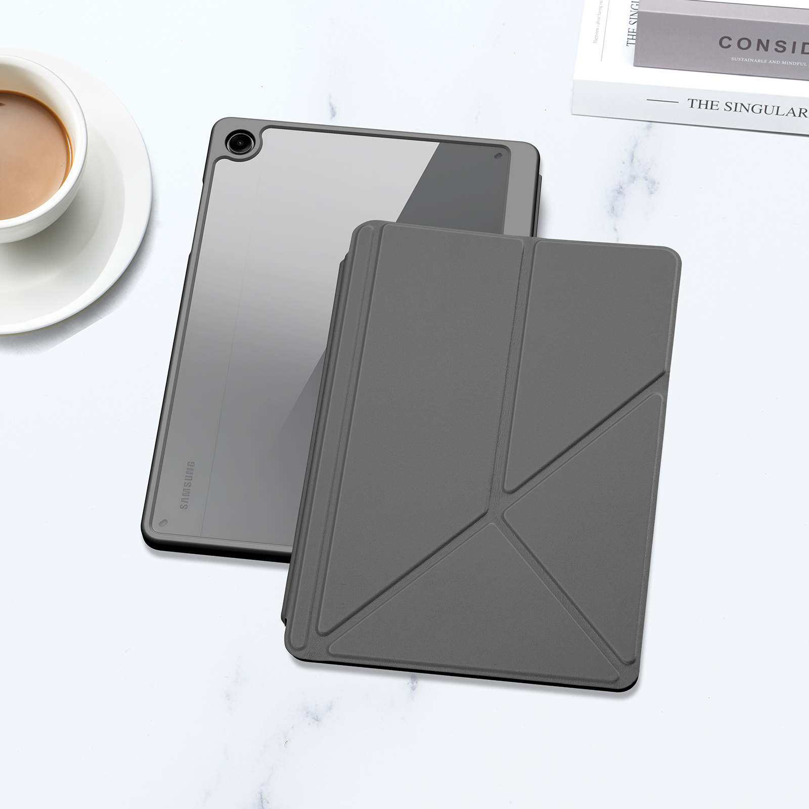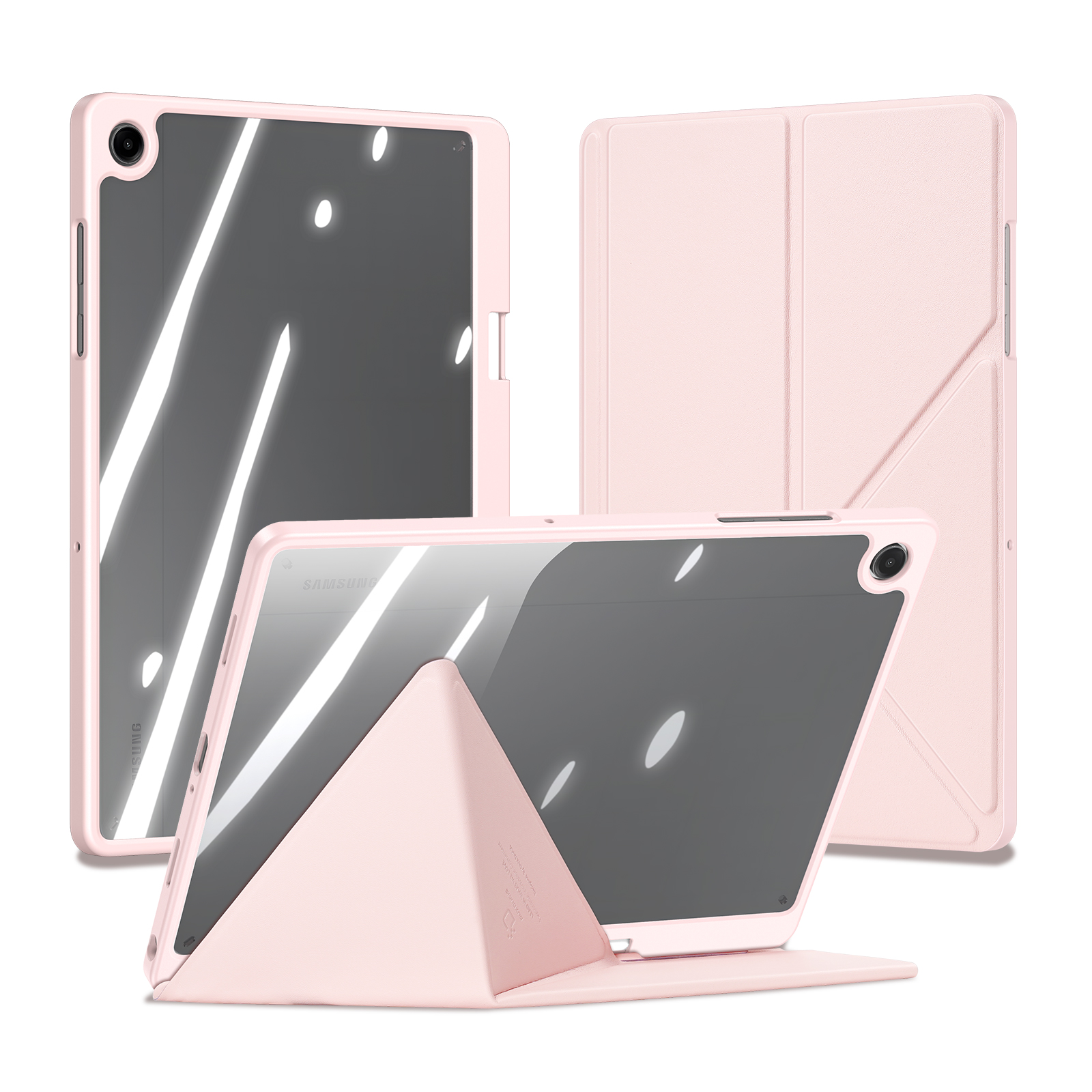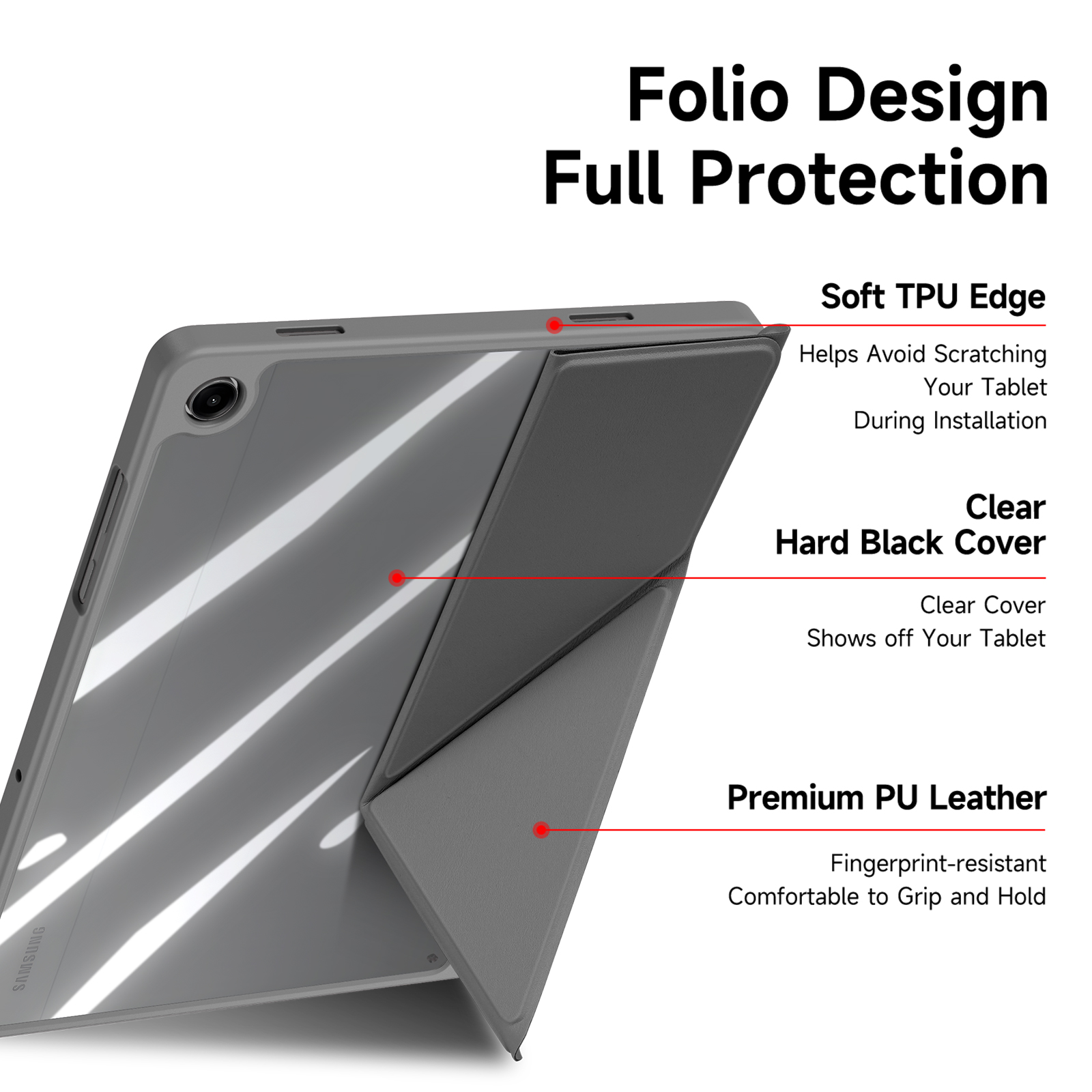 Creative front cover offers multiple stand angles to free your hands when viewing, browsing on the tablet. Clear back cover can be detached from the front cover and used independently, which is perfect for playing games on the tablet.