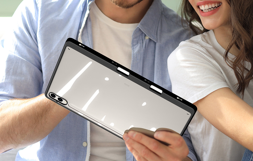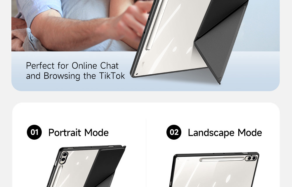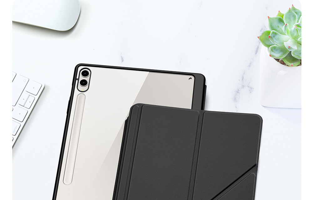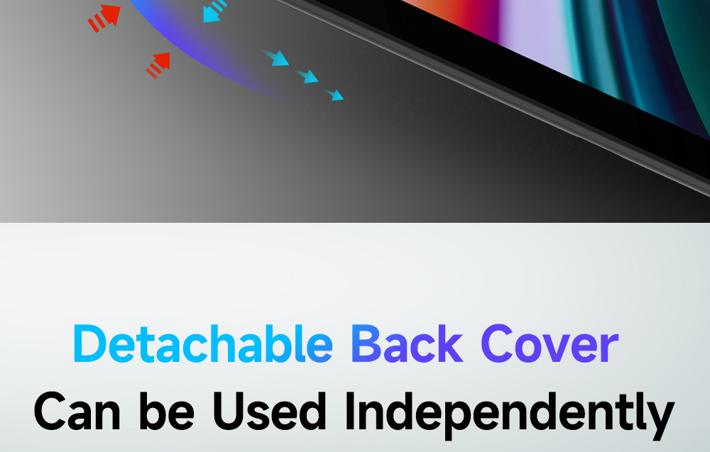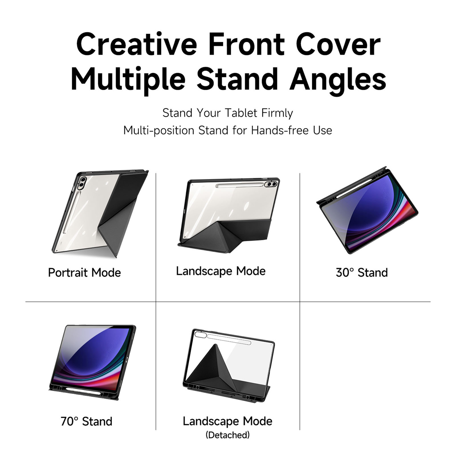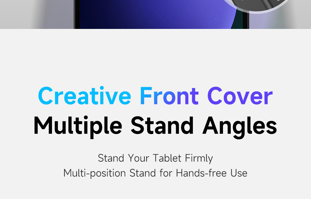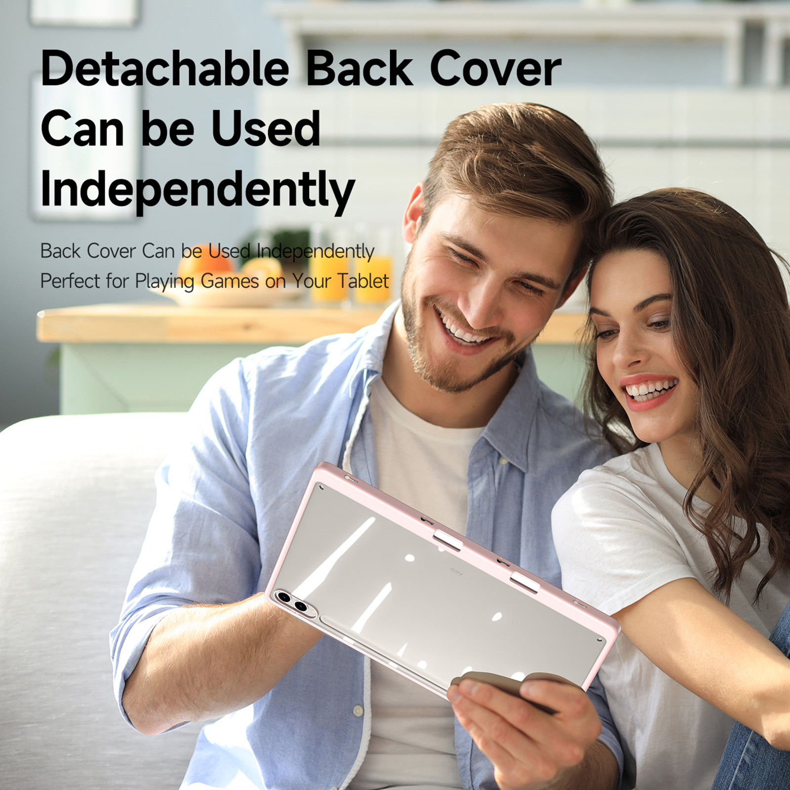 Creative front cover offers multiple stand angles to free your hands when viewing, browsing on the tablet. Clear back cover can be detached from the front cover and used independently, which is perfect for playing games on the tablet.