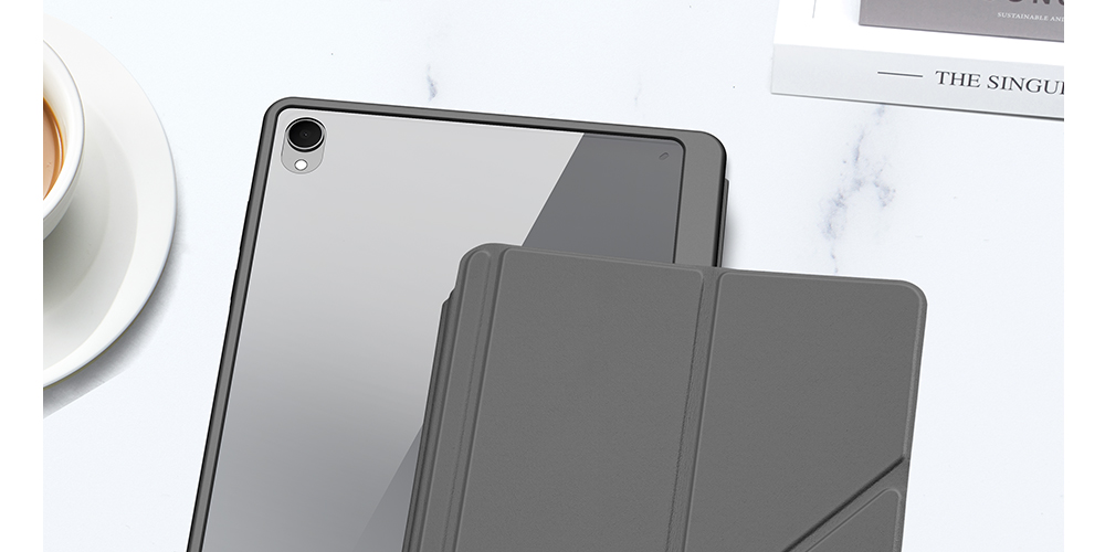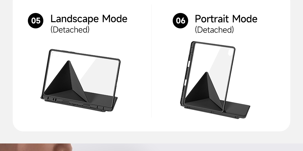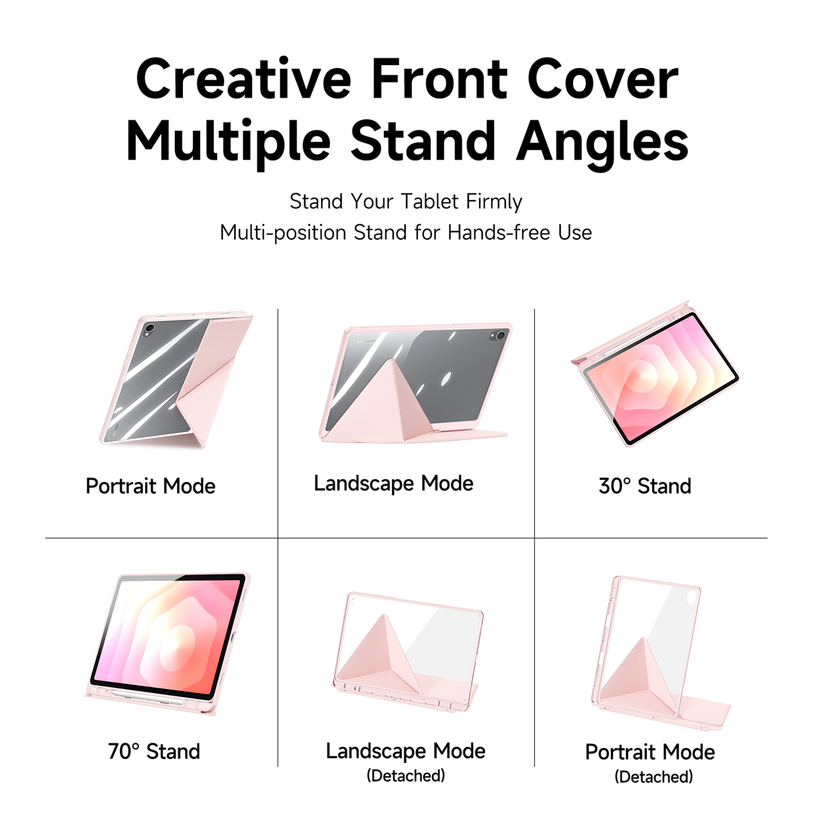 Creative front cover offers multiple stand angles to free your hands when viewing, browsing on the tablet. Clear back cover can be detached from the front cover and used independently, which is perfect for playing games on the tablet.
