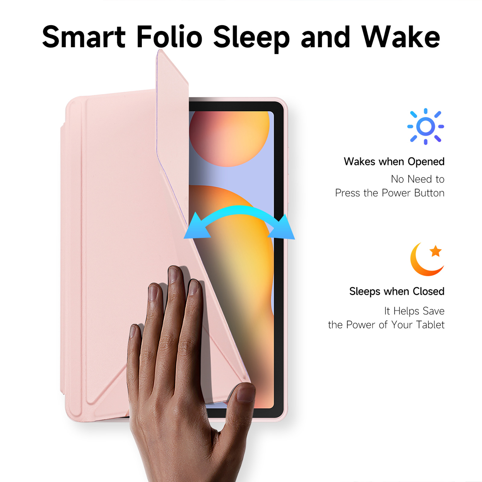 Smart folio offers wake/sleep function, it automatically wakes your tablet when opened and puts it to sleep when closed.