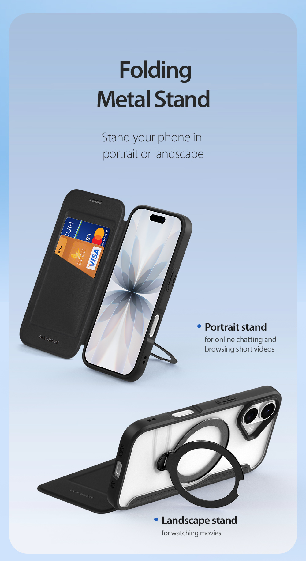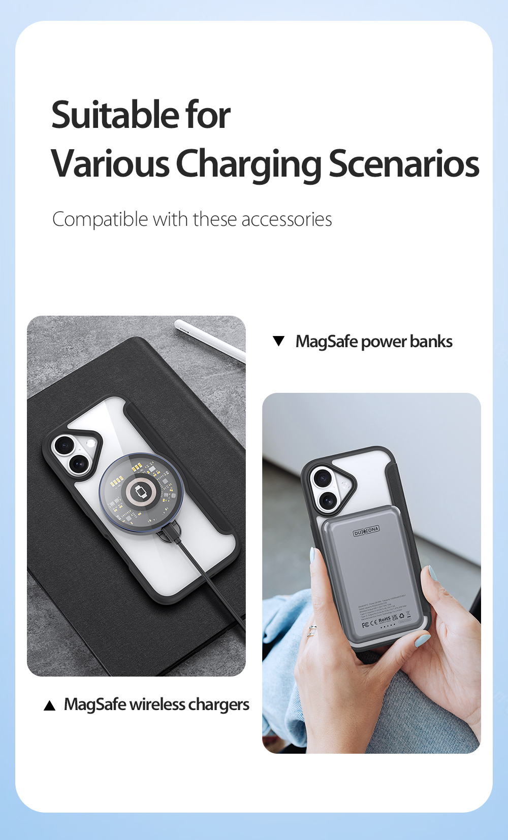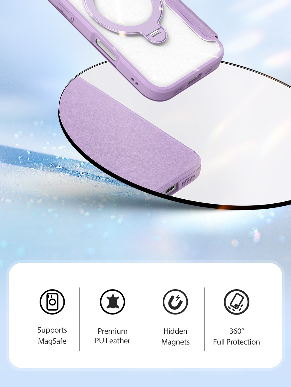 The world's first folio case with MagSafe, it works with Apple’s MagSafe chargers, wallets, power banks. When it’s time to charge your phone, just leave the case on your phone and attach to your MagSafe charger.