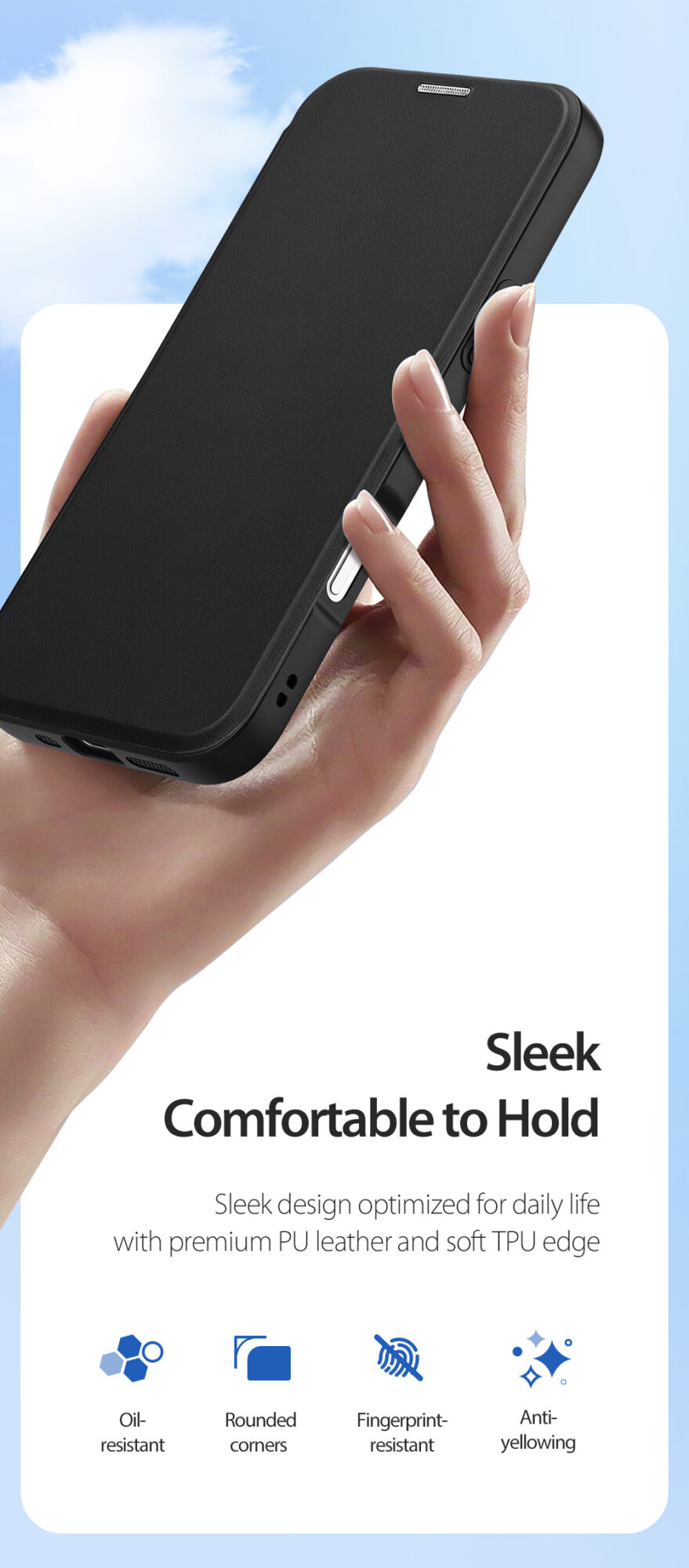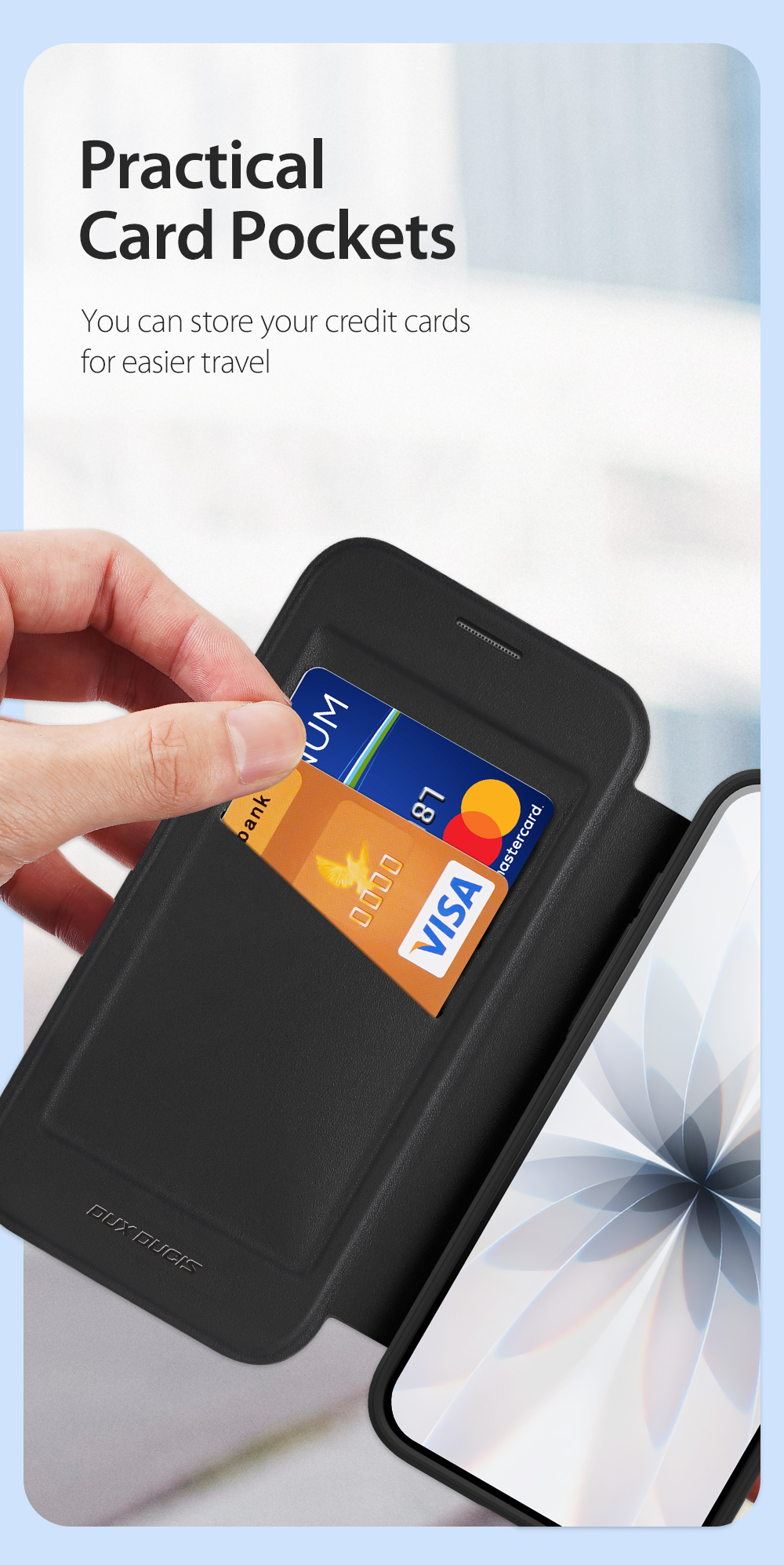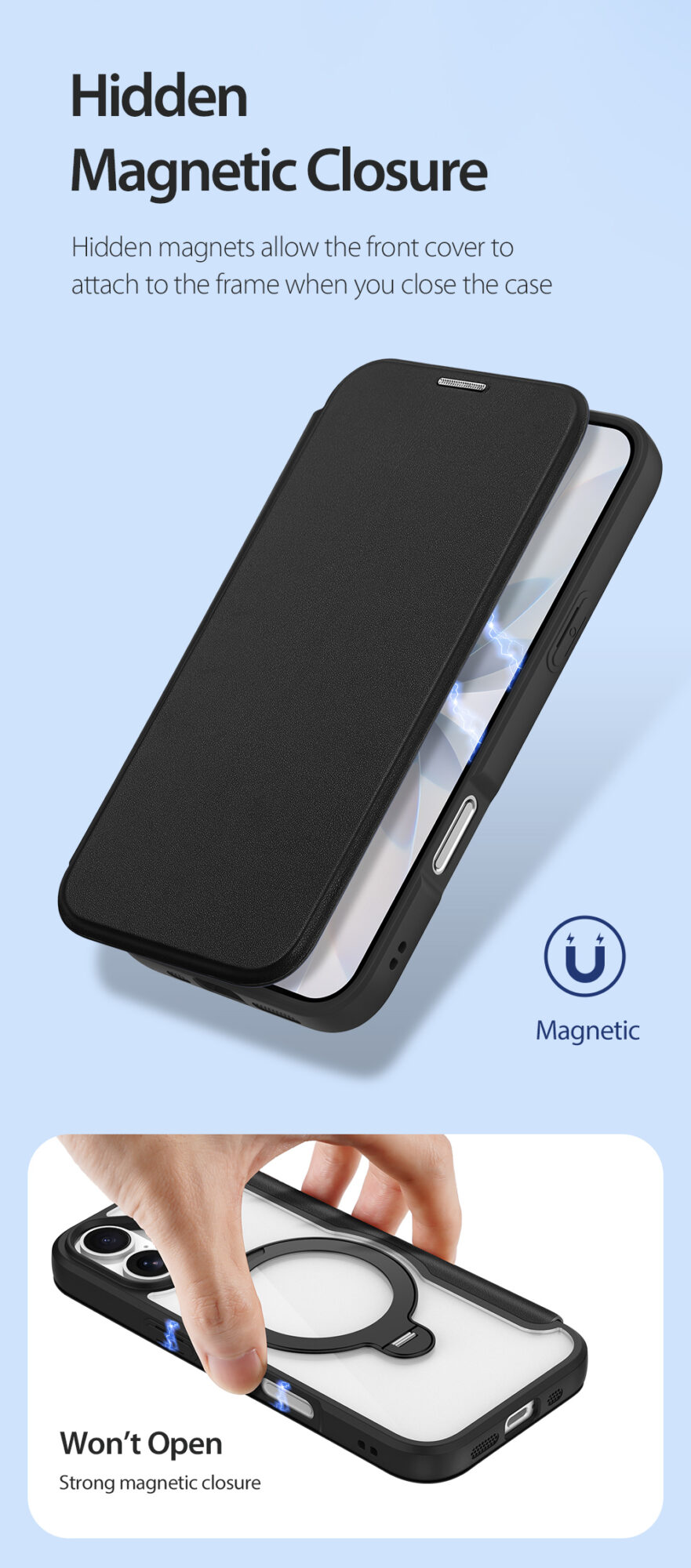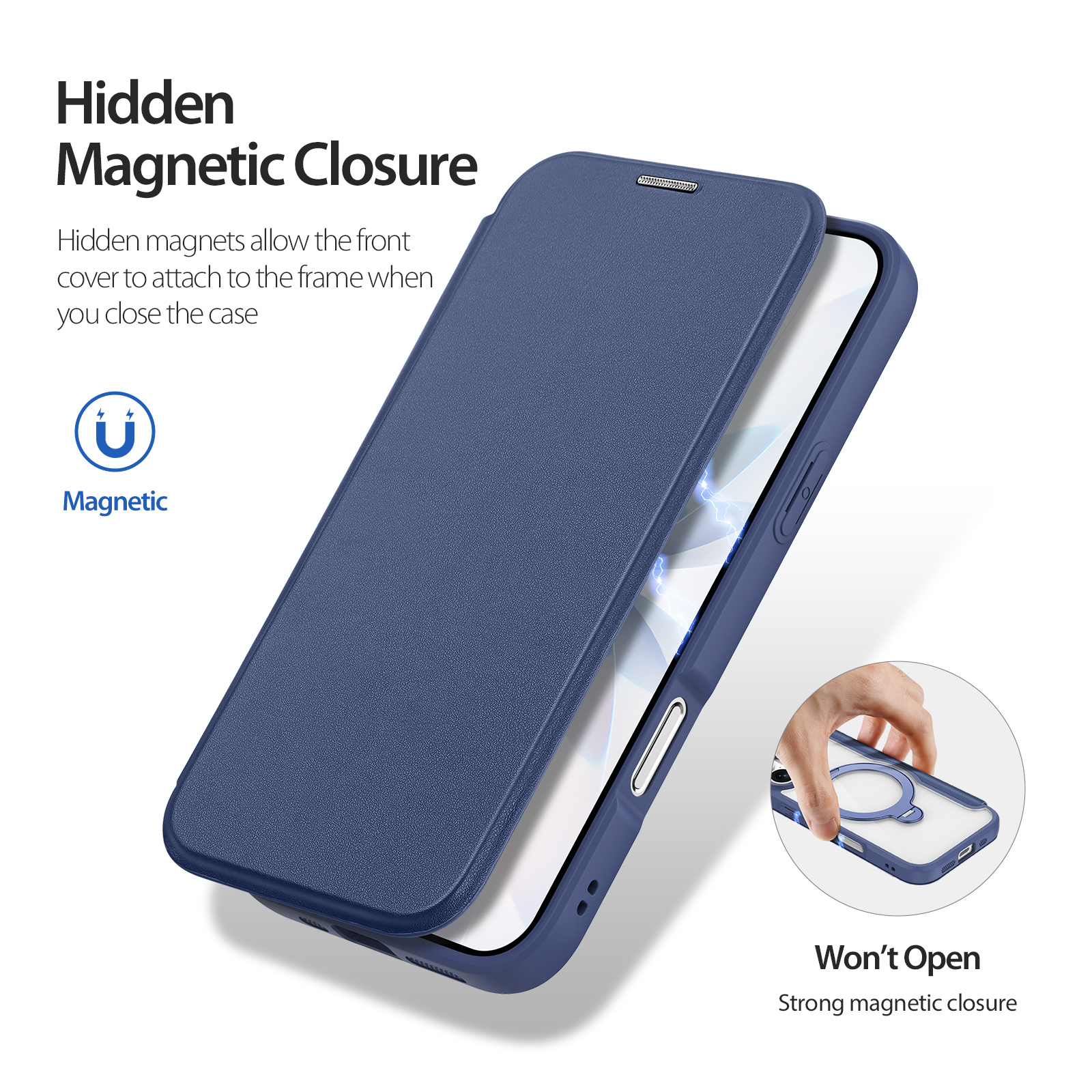Hidden magnets allow the front cover to attach to the frame when you close the case, strong magnetic closure keeps your phone encased in the case.