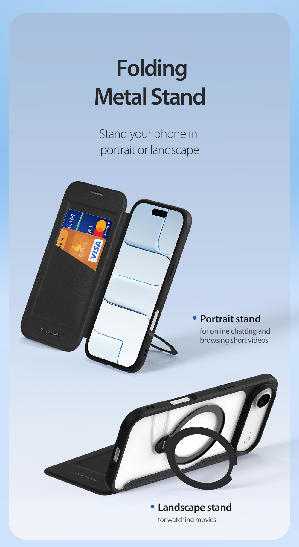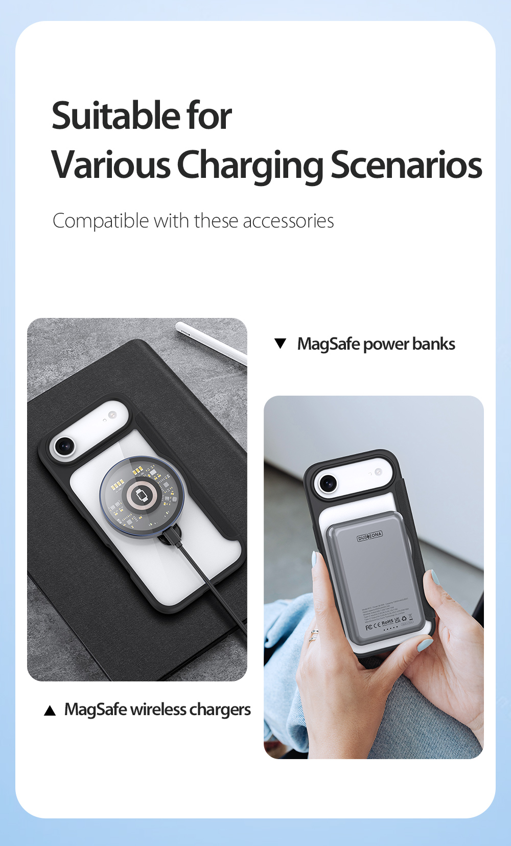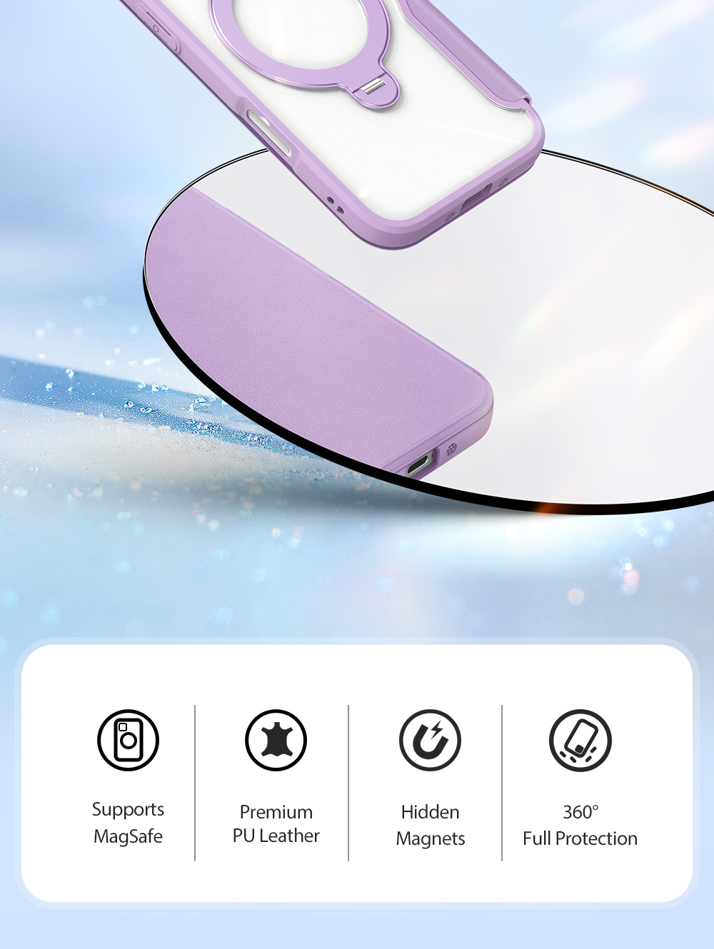 The world's first folio case with MagSafe, it works with Apple’s MagSafe chargers, wallets, power banks. When it’s time to charge your phone, just leave the case on your phone and attach to your MagSafe charger.