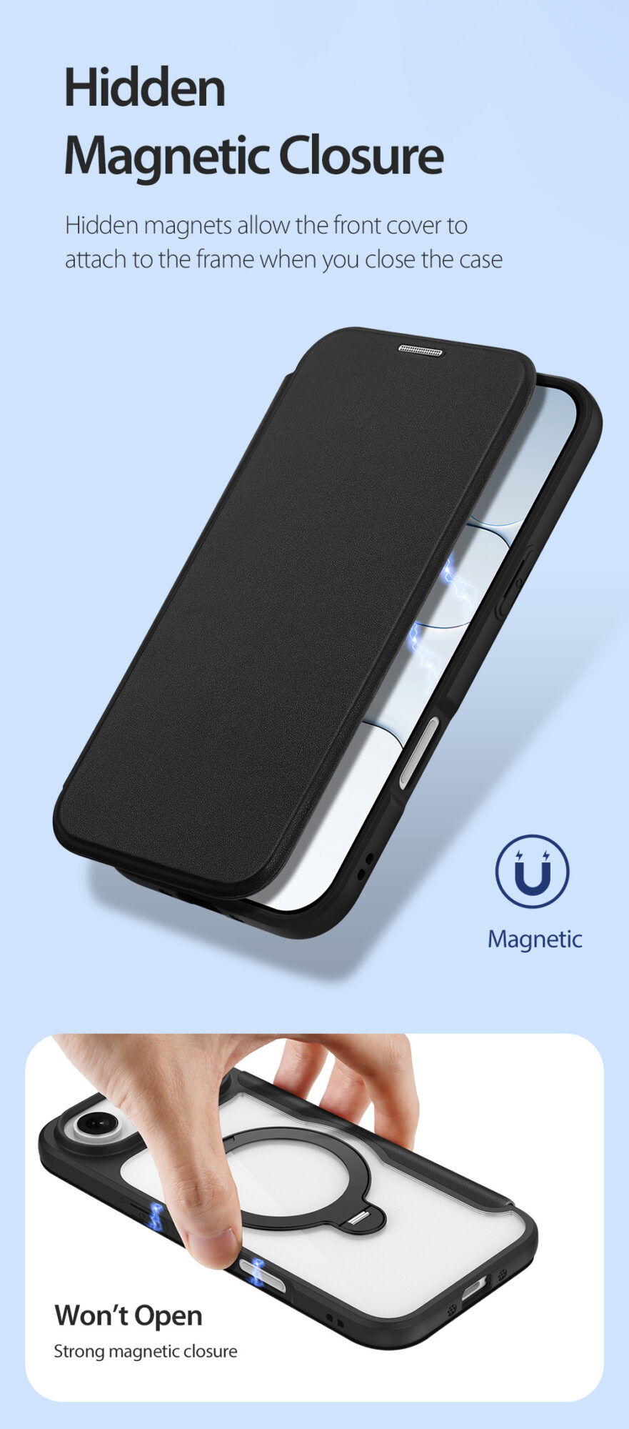Hidden magnets allow the front cover to attach to the frame when you close the case, strong magnetic closure keeps your phone encased in the case.