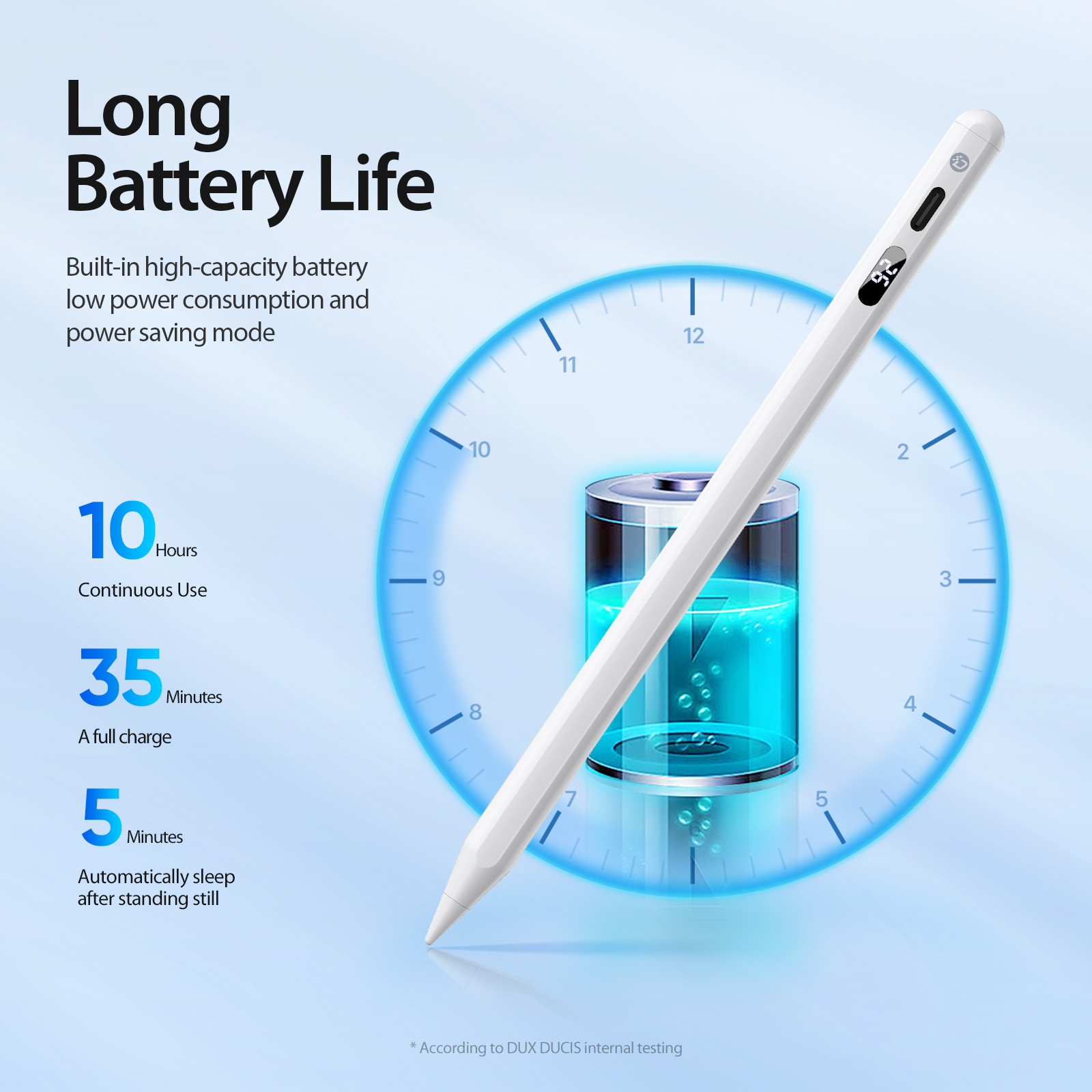 A full charge takes about 35 minutes and the pen can be used continuously for 10 hours on a full charge.