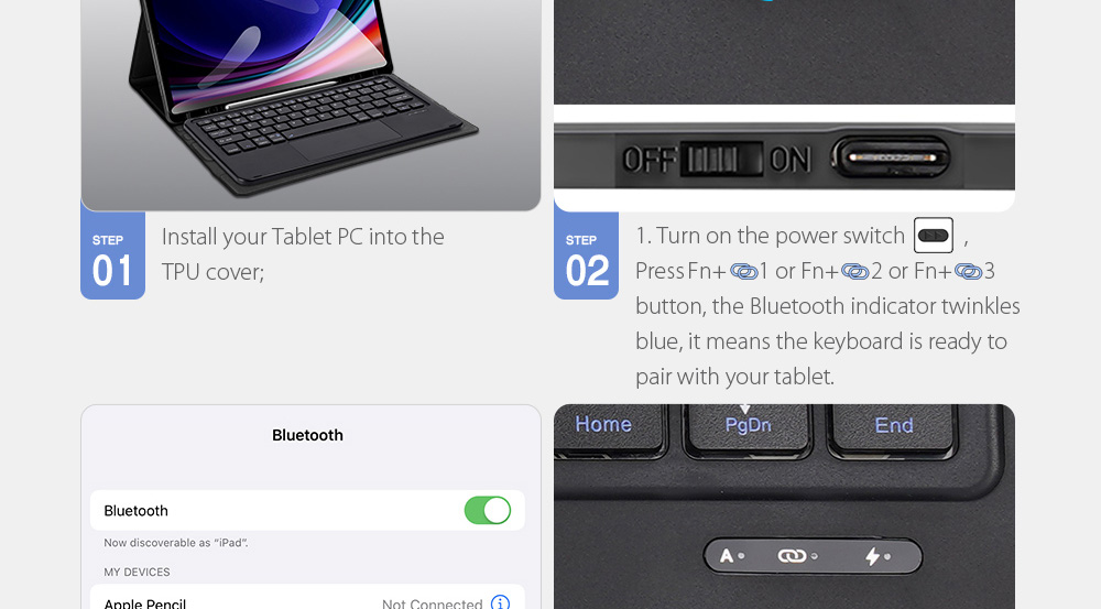 Pair Samsung Tab S9 to the keyboard via Bluetooth, and keyboard is able to work 30 days with no interruptions once it is fully charged.