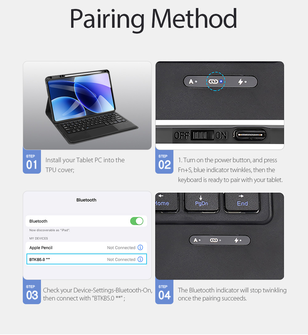 Pair Xiaomi Pad to the keyboard via Bluetooth, and keyboard is able to work 30 days with no interruptions once it is fully charged.