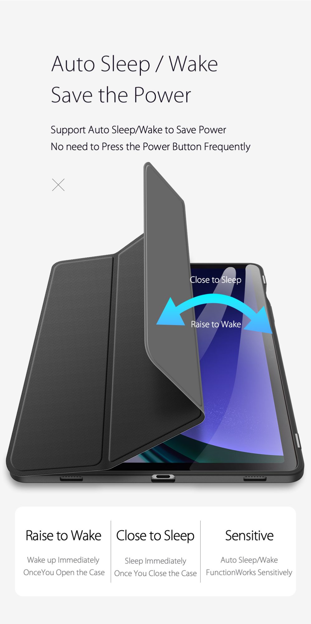 Comes with wake/sleep function, raise the case, the tablet wakes up; close the case, the tablet sleeps.