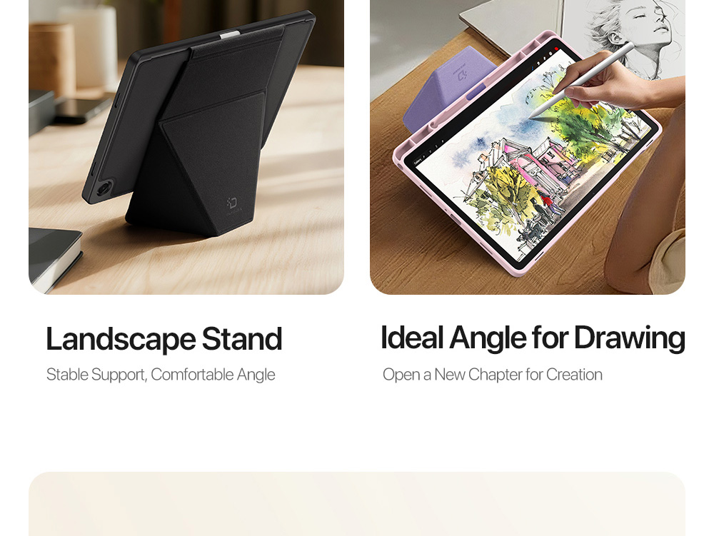 One case, three modes: landscape/portrait/drawing angles.