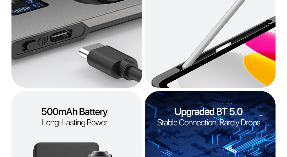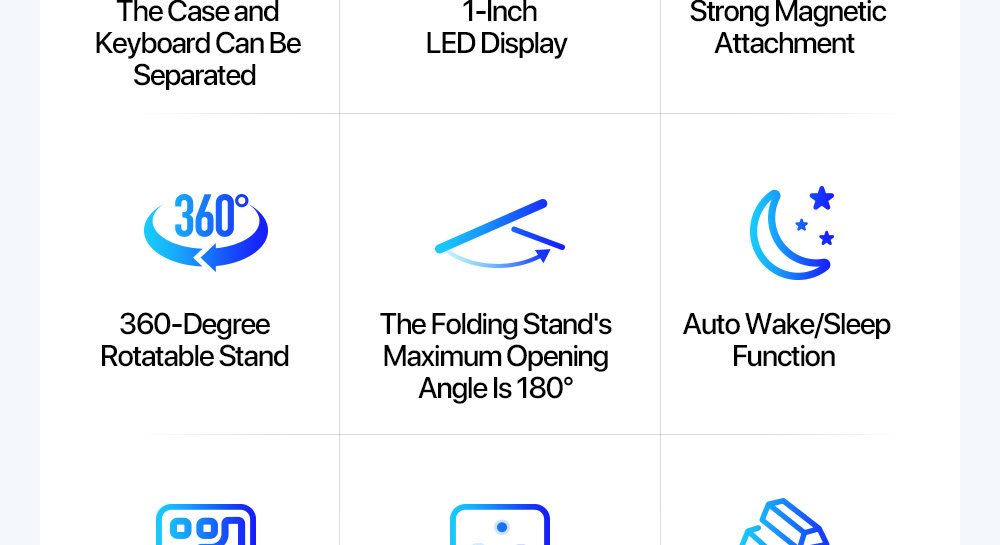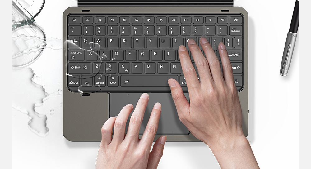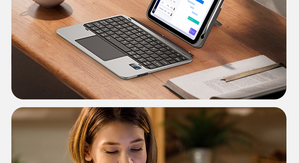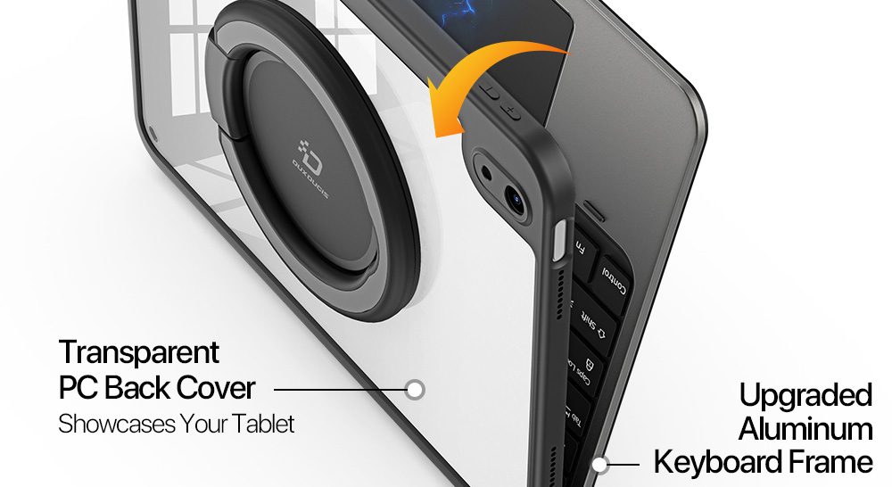 Material: Aircraft-grade aluminum frame + Flexible TPU + Transparent PC back cover + PU leather + ABS keycaps