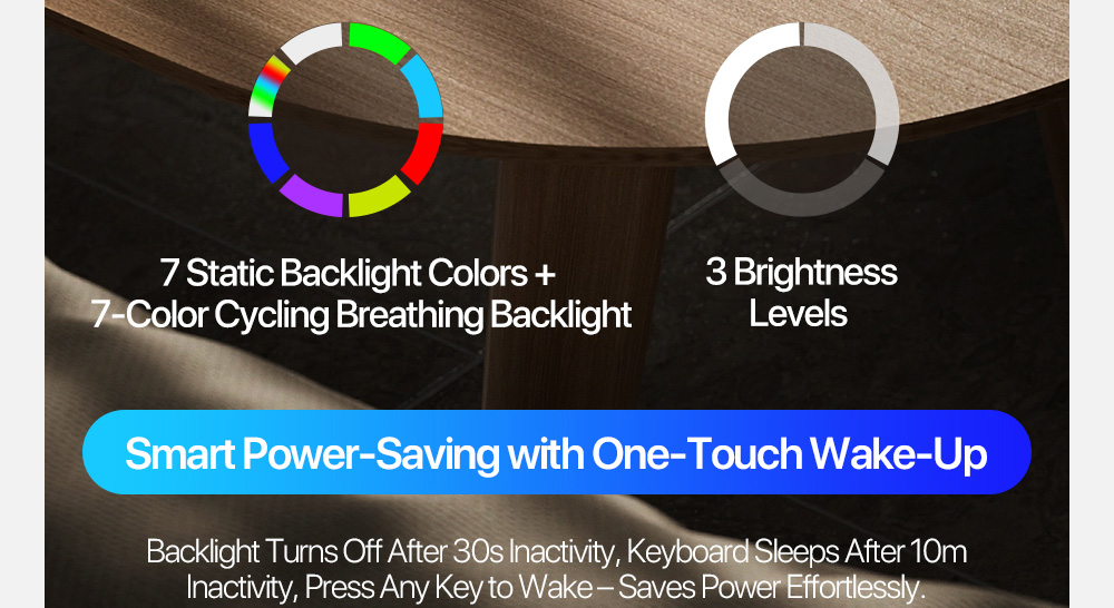 Colorful backlit keyboard with 7 static colors and 7-color cycling breathing light.